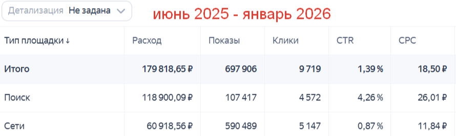Цена клика: Поиск - 25 руб, РСЯ - 13 руб.