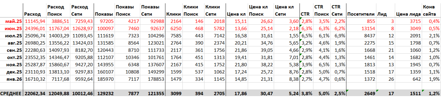 Цена клика: Поиск - 30 руб, РСЯ - 5 руб.